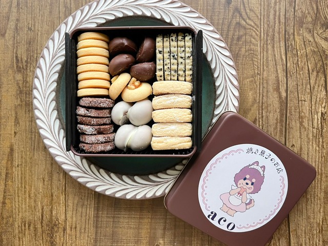 焼き菓子のお店acoで人気のクッキーを、 ぎゅぎゅっと詰めたクッキー缶です。 涼しい季節限定のものになります♡ (缶外寸:122×122×H43mm) *レモンクッキー(8枚) *Wチョコディアマン(6枚) *まんまるチョコ/ココア(4個) *まんまるチョコ/苺(4個) *ナッツのクッキー(2個) *ごまクッキー(5枚) *ポルボロン/プレーン(5枚) 賞味期限は、発送日よりクッキーは20日となっております。 (開封後は湿気やすいため、お早めにお召し上がりください。) また、お届け後は直射日光・高温多湿を避け涼しいところで、保存をお願いします。 *特定原材料* 小麦、卵、乳 (本製品の製造工房では、落花生を含む製品を製造しております) *配送中の破損について* クッキーはとてもデリケートです。厳重に梱包しておりますが、発送後万一の事故・破損についてご了承いただける場合のみご注文お願いいたしま