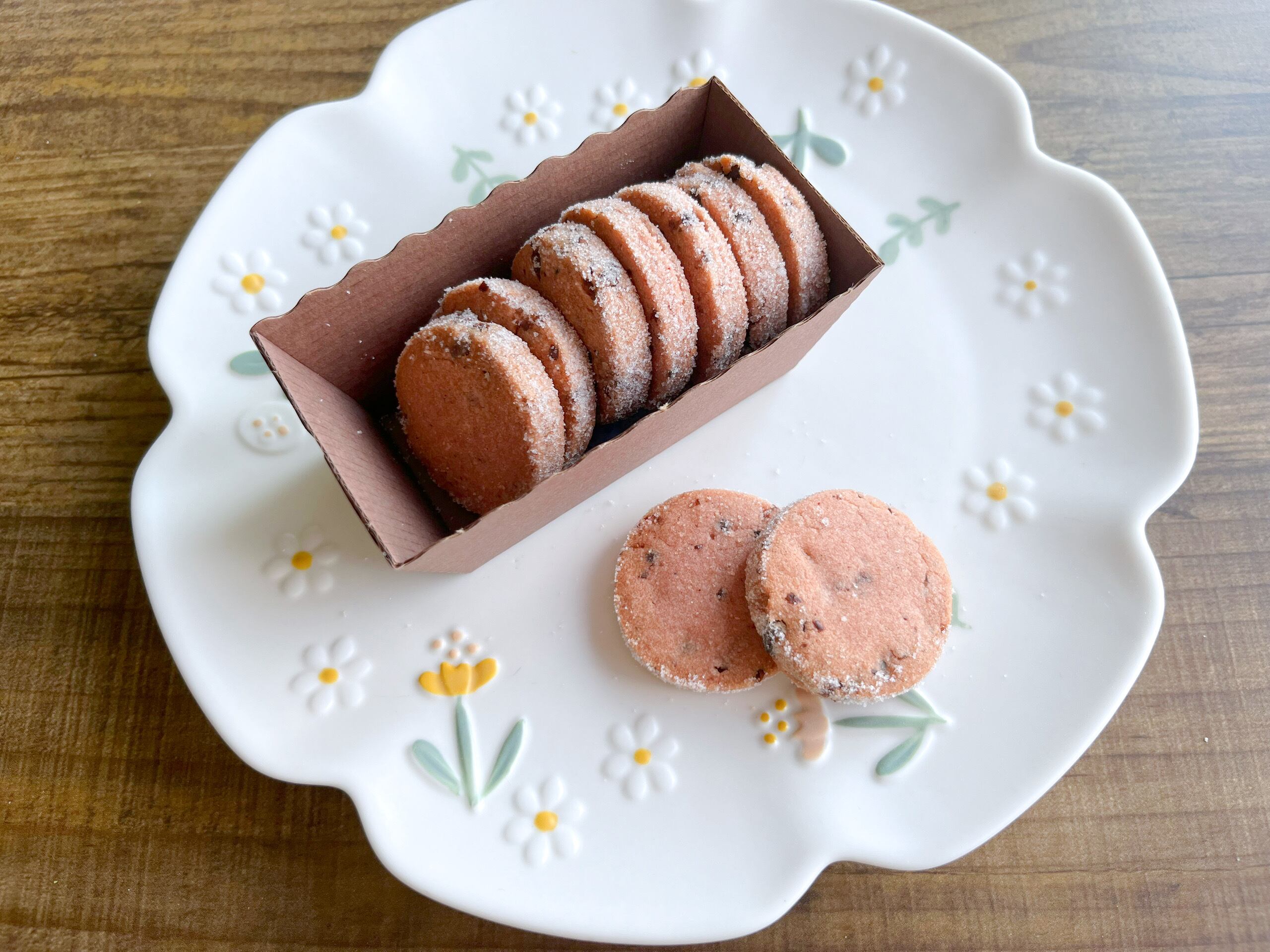 桜味のクッキーに、フリーズドライのあずきを入れました。